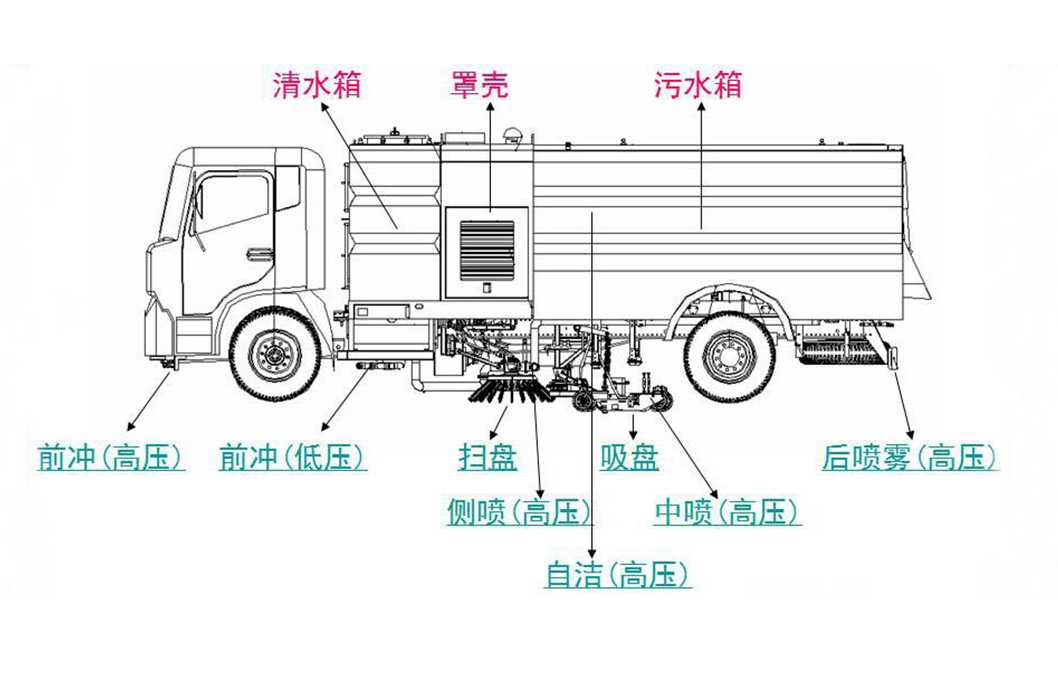 上裝配置:帶不銹鋼箱體,容積為9立方,帶2個中置掃盤,康明斯170馬力副發動機;意大利馬達;德國高壓水泵(前沖/側噴/中噴/后噴霧/沖洗水槍/垃圾箱自潔裝置);萬向高壓路沿清洗噴頭,威龍低壓泵(前沖);不銹鋼垃圾箱;不銹鋼管高壓管路;德國控制器;韓國控制箱;PLC一鍵控制;尾部LED箭頭燈;機油、垃圾箱、水箱均帶防溢低水位報警裝置;倒車及洗掃狀態室內監視器。18m高壓沖洗卷盤。清掃寬度3.5m;清洗壓力10MPa;吸入粒度φ110mm。